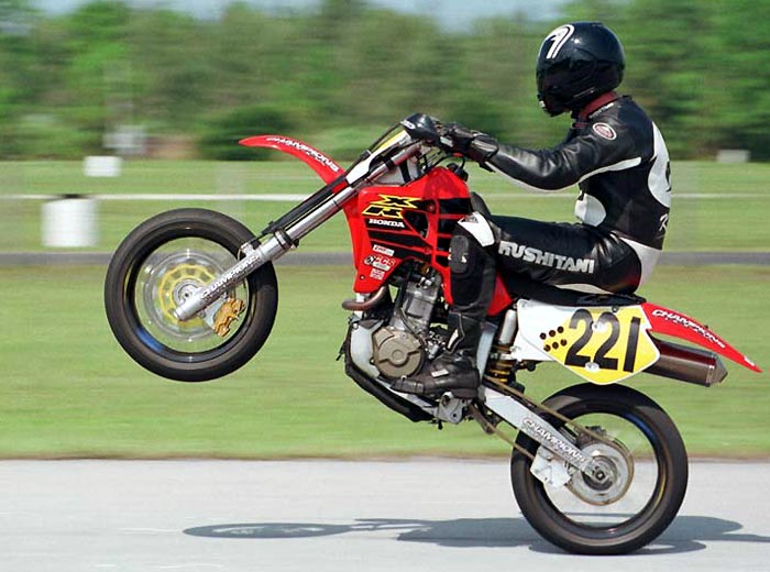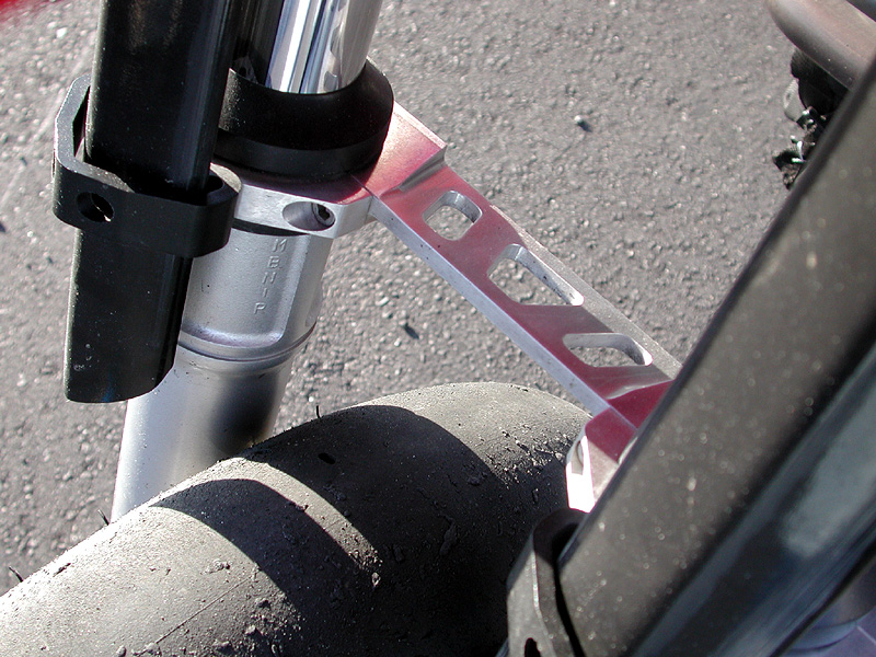 I also tied the front end together quite nicely using a Summers Racing Components fork brace. The stock forks are light, but a tad flimsy. The forks would flex around the left hand fork leg and caliper on hard braking. Once I added the Summers brace the forks were as flex free as a pair of inverted, were still light (obviously) and totally transformed the handling in one go. Best handling mod for the money - period. |